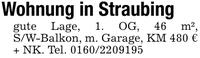 Wohnung in Straubing gute Lage, 1. OG, 46 m², S/W-Balkon, m. Garage, KM 480 € + NK. Tel. ***