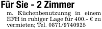 Für Sie - 2 Zimmerm. Küchenbenutzunng in einem EFH in ruhiger Lage für 400.- € zu vermieten; Tel. ***