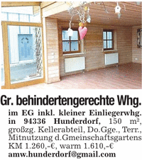 Gr. behindertengerechte Whg.im EG inkl. kleiner Einliegerwhg. in 94336 Hunderdorf, 150 m², großzg. Kellerabteil, Do.Gge., Terr., Mitnutzung d.Gmeinschaftsgartens KM 1.260,-€, warm 1.610,-€amw.hunderdorf@gmail.com