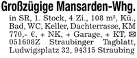 Großzügige Mansarden-Whg.in SR, 1. Stock, 4 Zi., 108 m², Kü., Bad, WC, Keller, Dachterrasse, KM 770,- €, + NK, + Garage, + KT, _ ***Z Straubinger Tagblatt, Ludwigsplatz 32, 94315 Straubing