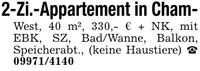 2-Zi.-Appartement in Cham-West, 40 m², 330,- € + NK, mit EBK, SZ, Bad/Wanne, Balkon, Speicherabt., (keine Haustiere) _ ***