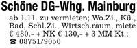 Schöne DG-Whg. Mainburgab 1.11. zu vermieten; Wo.Zi., Kü., Bad, Schl.Zi., Wirtsch.raum, miete € 480.- + NK € 130,- + 3 MM Kt.;_ ***