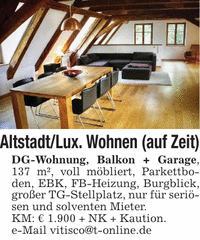 Altstadt/Lux. Wohnen (auf Zeit)DG-Wohnung, Balkon + Garage, 137 m², voll möbliert, Parkettboden, EBK, FB-Heizung, Burgblick, großer TG-Stellplatz, nur für seriösen und solventen Mieter.KM: € 1.900 + NK + Kaution.e-Mail vitisco@t-online.de