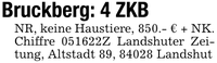 Bruckberg: 4 ZKBNR, keine Haustiere, 850.- € + NK.Chiffre ***Z Landshuter Zeitung, Altstadt 89, 84028 Landshut
