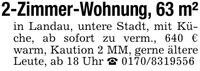 2-Zimmer-Wohnung, 63 m²in Landau, untere Stadt, mit Küche, ab sofort zu verm., 640 € warm, Kaution 2 MM, gerne ältere Leute, ab 18 Uhr _ ***