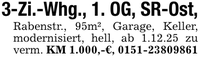3-Zi.-Whg., 1. OG, SR-Ost,Rabenstr., 95m², Garage, Keller, modernisiert, hell, ab 1.12.25 zu verm. KM 1.000,-€, ***