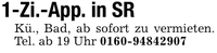 1-Zi.-App. in SRKü., Bad, ab sofort zu vermieten. Tel. ab 19 Uhr ***