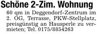 Schöne 2-Zim. Wohnung60 qm in Deggendorf-Zentrum im 2. OG, Terrasse, PKW-Stellplatz, preisgünstig an Hausperle zu vermieten; Tel. ***