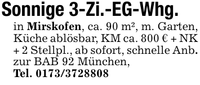 Sonnige 3-Zi.-EG-Whg.in Mirskofen, ca. 90 m², m. Garten, Küche ablösbar, KM ca. 800 € + NK + 2 Stellpl., ab sofort, schnelle Anb. zur BAB 92 München,Tel. ***