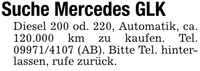 Suche Mercedes GLKDiesel 200 od. 220, Automatik, ca. 120.000 km zu kaufen. Tel. *** (AB). Bitte Tel. hinterlassen, rufe zurück.