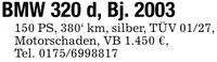 BMW 320 d, Bj. *** PS, 380' km, silber, TÜV 01/27, Motorschaden, VB 1.450 €,Tel. ***