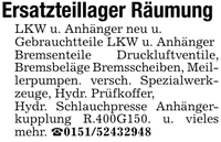 Ersatzteillager RäumungLKW u. Anhänger neu u.Gebrauchtteile LKW u. AnhängerBremsenteile Druckluftventile, Bremsbeläge Bremsscheiben, Meillerpumpen. versch. Spezialwerkzeuge, Hydr. Prüfkoffer,Hydr. Schlauchpresse Anhängerkupplung R.400G150. u. vieles mehr. _***