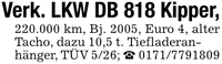 Verk. LKW DB 818 Kipper,220.000 km, Bj. 2005, Euro 4, alter Tacho, dazu 10,5 t. Tiefladeranhänger, TÜV 5/26; _ ***