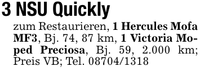 3 NSU Quicklyzum Restaurieren, 1 Hercules Mofa MF3, Bj. 74, 87 km, 1 Victoria Moped Preciosa, Bj. 59, 2.000 km; Preis VB; Tel. ***