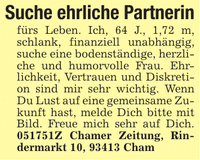 Suche ehrliche Partnerinfürs Leben. Ich, 64 J., 1,72 m, schlank, finanziell unabhängig, suche eine bodenständige, herzliche und humorvolle Frau. Ehrlichkeit, Vertrauen und Diskretion sind mir sehr wichtig. Wenn Du Lust auf eine gemeinsame Zukunft hast, melde Dich bitte mit Bild. Freue mich sehr auf Dich. ***Z Chamer Zeitung, Rindermarkt 10, 93413 Cham