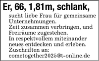 Er, 66, 1,81m, schlank,sucht liebe Frau für gemeinsame Unternehmungen.Zeit zusammen verbringen, undFreiräume zugestehen.In respektvollem miteinanderneues entdecken und erleben.Zuschriften an:cometogether2025@t-online.de