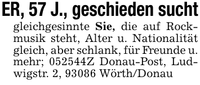 ER, 57 J., geschieden suchtgleichgesinnte Sie, die auf Rockmusik steht, Alter u. Nationalität gleich, aber schlank, für Freunde u. mehr; ***Z Donau-Post, Ludwigstr. 2, 93086 Wörth/Donau