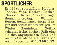 SPORTLICHER Er, 183 cm, sportl. Figur. Hobbies: Tanzen, Yoga, Kochen, Backen, Shoppen, Reisen, Theater, Yoga, Sonnenuntergänge, Wandern, Reisen, Schwimmen, Berge, Burgen und Schlösser besichtigen, im Winter Kaminfeuer, Netflix schauen, lecker kochen. Falls eine sie sich angesprochen fühlt und nicht älter als 58 ist würde ich mich freuen. Tel. ***