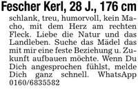 Fescher Kerl, 28 J., 176 cmschlank, treu, humorvoll, kein Macho, mit dem Herz am rechten Fleck. Liebe die Natur und das Landleben. Suche das Mädel das mit mir eine feste Beziehung u. Zukunft aufbauen möchte. Wenn Du Dich angesprochen fühlst, melde Dich ganz schnell. WhatsApp ***