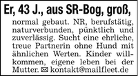 Er, 43 J., aus SR-Bog, groß, normal gebaut. NR, berufstätig, naturverbunden, pünktlich und zuverlässig. Sucht eine ehrliche, treue Partnerin ohne Hund mit ähnlichen Werten. Kinder willkommen, eigene leben bei der Mutter. _ kontakt@mailfleet.de