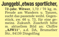 Junggebl.,etwas sportlicher, 72-jähr. Witwer, 1,72 / 70 kg, m. Freude am Wandern u. Tanzen, sucht das passende weibl. Gegenstück, zw. 66 u. 73, für eine gemeins. Zukunft. Zuschrift bitte m. aktuellem Bild an: Chiffre "AJW11", a.d. DA, Brumather Str., 84130 Dingolfing
