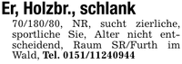 Er, Holzbr., schlank***, NR, sucht zierliche, sportliche Sie, Alter nicht entscheidend, Raum SR/Furth im Wald, Tel. ***