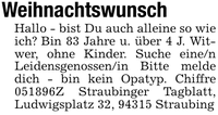 WeihnachtswunschHallo - bist Du auch alleine so wie ich? Bin 83 Jahre u. über 4 J. Witwer, ohne Kinder. Suche eine/n Leidensgenossen/in Bitte melde dich - bin kein Opatyp. Chiffre ***Z Straubinger Tagblatt, Ludwigsplatz 32, 94315 Straubing