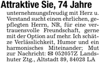 Attraktive Sie, 74 Jahreunternehmungsfreudig mit Herz u. Verstand sucht einen ehrlichen, gepflegten Herrn, NR, für eine vertrauensvolle Freundschaft, gerne mit der Option auf mehr. Ich schätze Verlässlichkeit, Humor und ein harmonisches Miteinander; Mut zur Nachricht: _ ***Z Landshuter Ztg., Altstadt 89, 84028 LA