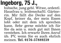 Ingeborg, 75 J.,hübsche, jung gebl. Witwe, ordentl. Hausfrau u. leidenschaftl. Gärtnerin. Mir fällt die Decke auf den Kopf, keiner da, der mein Essen lobt oder mit dem ich sprechen kann. Sehr gerne möchte ich für Sie da sein u. mich gut mit Ihnen verstehen. Ich erwarte Ihren Anruf üb. PV, wenn Sie es auch ehrlich meinen. Tel. ***