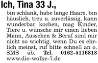 Ich, Tina 33 J.,bin schlank, habe lange Haare, bin häuslich, treu u. zuverlässig, kann wunderbar kochen, mag Kinder, Tiere u. wünsche mir einen lieben Mann, Aussehen & Beruf sind mir nicht so wichtig, wenn Du es ehrlich meinst, ruf bitte schnell an o. SMS üb. Tel. *** www.die-wolke-7.de