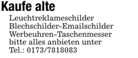 Kaufe alteLeuchtreklameschilderBlechschilder-EmailschilderWerbeuhren-Taschenmesserbitte alles anbieten unterTel.: ***