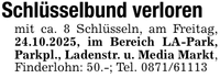 Schlüsselbund verlorenmit ca. 8 Schlüsseln, am Freitag, 24.10.2025, im Bereich LA-Park, Parkpl., Ladenstr. u. Media Markt, Finderlohn: 50.-; Tel. ***