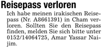 Reisepass verlorenIch habe meinen irakischen Reisepass (Nr. A***) in Cham verloren. Sollten Sie den Reisepass finden, melden Sie sich bitte unter ***, Amar Yassar Naijim.