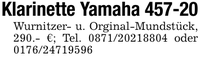 Klarinette Yamaha 457-20Wurnitzer- u. Orginal-Mundstück, 290.- €; Tel. *** oder ***