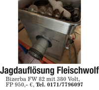 Jagdauflösung Fleischwolf Bizerba FW 82 mit 380 Volt, FP 950,- €, Tel. ***