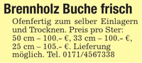 Brennholz Buche frisch Ofenfertig zum selber Einlagern und Trocknen. Preis pro Ster:50 cm - 100.- €, 33 cm - 100.- €,25 cm - 105.- €. Lieferungmöglich. Tel. ***