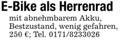 E-Bike als Herrenradmit abnehmbarem Akku,Bestzustand, wenig gefahren,250 €; Tel. ***