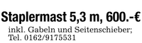Staplermast 5,3 m, 600.-€inkl. Gabeln und Seitenschieber; Tel. ***