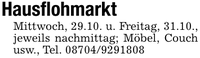 HausflohmarktMittwoch, 29.10. u. Freitag, 31.10., jeweils nachmittag; Möbel, Couch usw., Tel. ***