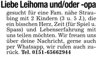 Liebe Leihoma und/oder -opagesucht für eine Fam. nähe Straubing mit 2 Kindern (3 u. 5 J.), die ein bisschen Herz, Zeit (für Spiel u. Spass) und Lebenserfahrung mit uns teilen möchten. Wir freuen uns über deine Nachricht, gerne auch per Whatsapp, wir rufen auch zurück. Tel. ***