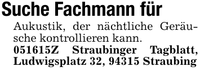 Suche Fachmann fürAukustik, der nächtliche Geräusche kontrollieren kann. ***Z Straubinger Tagblatt, Ludwigsplatz 32, 94315 Straubing