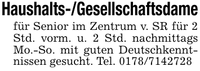 Haushalts-/Gesellschaftsdamefür Senior im Zentrum v. SR für 2 Std. vorm. u. 2 Std. nachmittags Mo.-So. mit guten Deutschkenntnissen gesucht. Tel. ***