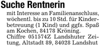 Suche Rentnerinmit Interesse an Familienanschluss,wöchentl. bis zu 10 Std. für Kinder-betreuung (1 Kind) und ggfs. Spaß am Kochen, 84178 Kröning.Chiffre ***Z Landshuter Zeitung, Altstadt 89, 84028 Landshut