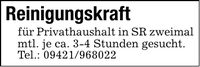 Reinigungskraftfür Privathaushalt in SR zweimal mtl. je ca. 3-4 Stunden gesucht.Tel.: ***