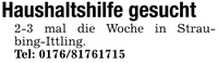 Haushaltshilfe gesucht 2-3 mal die Woche in Straubing-Ittling. Tel: ***
