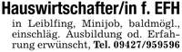 Hauswirtschafter/in f. EFHin Leiblfing, Minijob, baldmögl., einschläg. Ausbildung od. Erfahrung erwünscht, Tel. ***