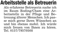Arbeitsstelle als BetreuerinAls erfahrene Betreuerin suche ich im Raum Roding/Cham eine Arbeitsstelle in der Pflege und Betreuung älterer Menschen. Ich passe mich gerne Ihren Wünschen an und bin ebenso mobil. Ich würde mich freuen von Ihnen zu hören. Tel. ***