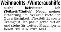 Weihnachts-/Winteraushilfesucht befristeten Job (Teilzeit/Minijob). Neben meiner Erfahrung im Verkauf biete ich Zuverlässigkeit, Flexibilität sowie Teamgeist. Ich packe gerne mit an und stehe für weitere Fragen gerne bereit. Tel. ***