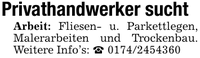 Privathandwerker suchtArbeit: Fliesen- u. Parkettlegen, Malerarbeiten und Trockenbau. Weitere Info's: _ ***