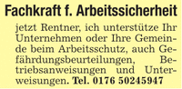 Fachkraft f. Arbeitssicherheitjetzt Rentner, ich unterstütze Ihr Unternehmen oder Ihre Gemeinde beim Arbeitsschutz, auch Gefährdungsbeurteilungen, Betriebsanweisungen und Unterweisungen. Tel. ***